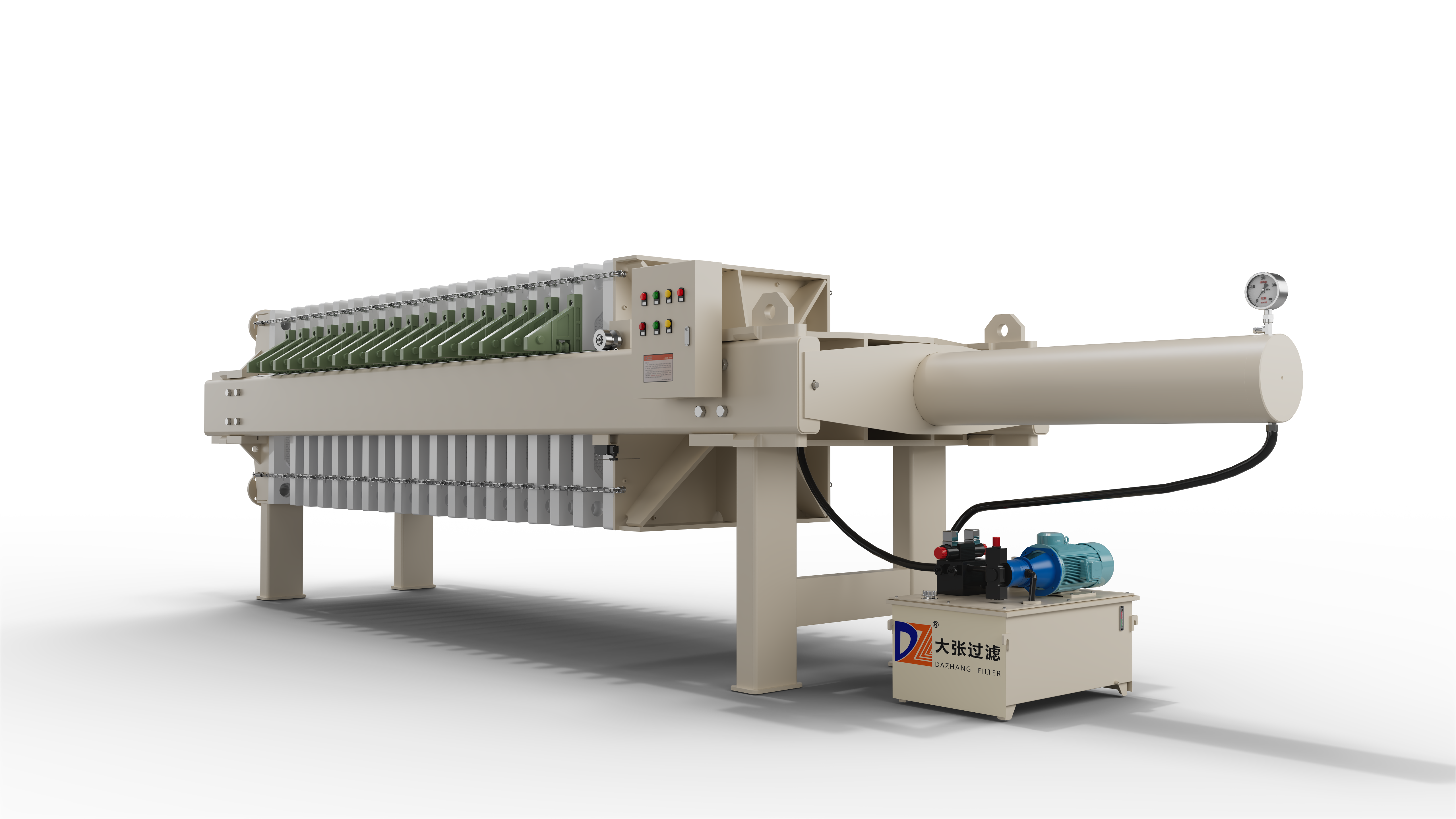 一次快速拉開壓濾機(jī),采用加長型的油缸驅(qū)動(dòng),配合加長機(jī)架,通過不銹鋼鏈條(或滑片)帶動(dòng)連接每一塊濾板,在壓緊板的帶動(dòng)下實(shí)現(xiàn)濾板的一次性全部打開。配合自動(dòng)振打裝置,對等距離拉開的濾板實(shí)現(xiàn)震動(dòng)輔助卸料功能,可實(shí)現(xiàn)全自動(dòng)卸料。