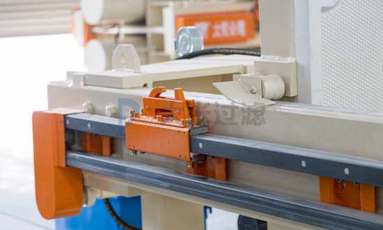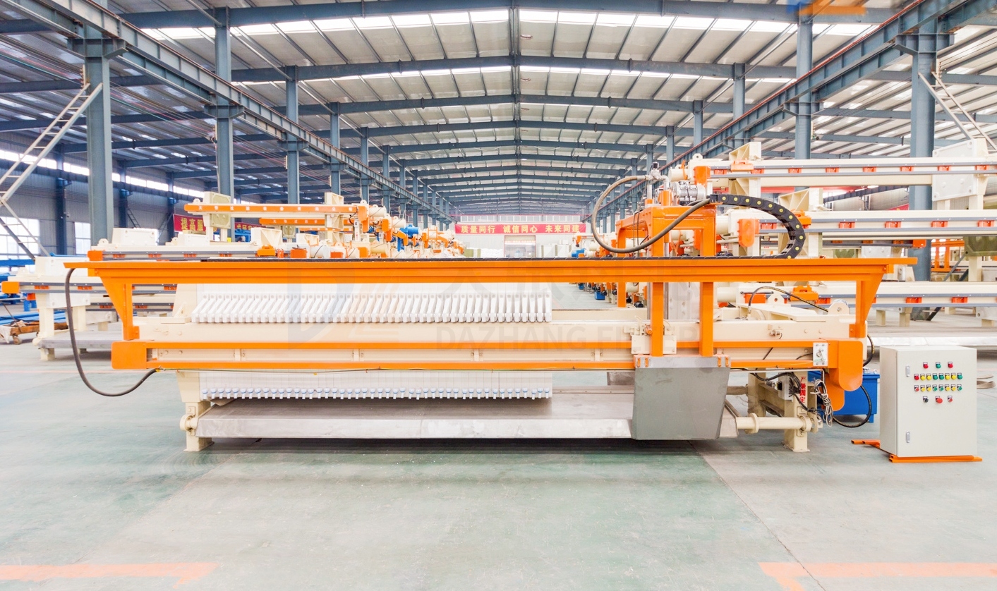 高效節(jié)能壓濾機(jī)是在自動拉板壓濾機(jī)基礎(chǔ)上增加更換了機(jī)械手,加長了油缸,增加了區(qū)間,一次拉開多塊濾板卸料。